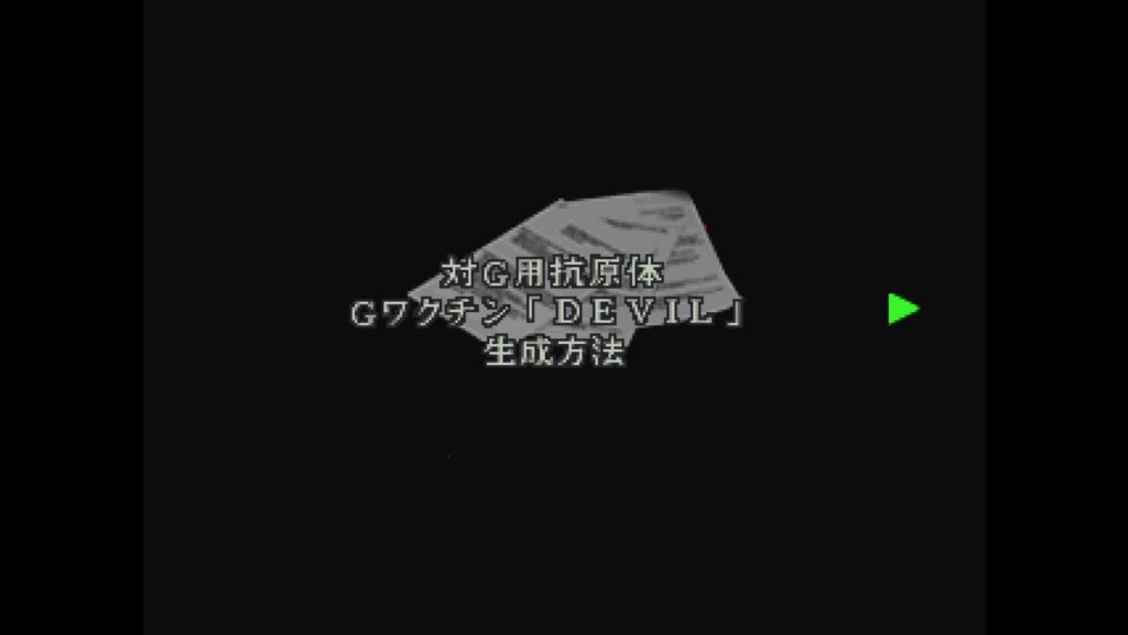 このファイルでは単にワクチン生成のヒントをプレイヤーに与えるだけでなく、Gウイルス感染生物が単純に“ウイルス症状”を呈するわけではなく、「胚を他者に産み付け」「宿主を自身の細胞構造で置き換える」という極めて生物兵器的かつホラー的な展開が説明されている。
