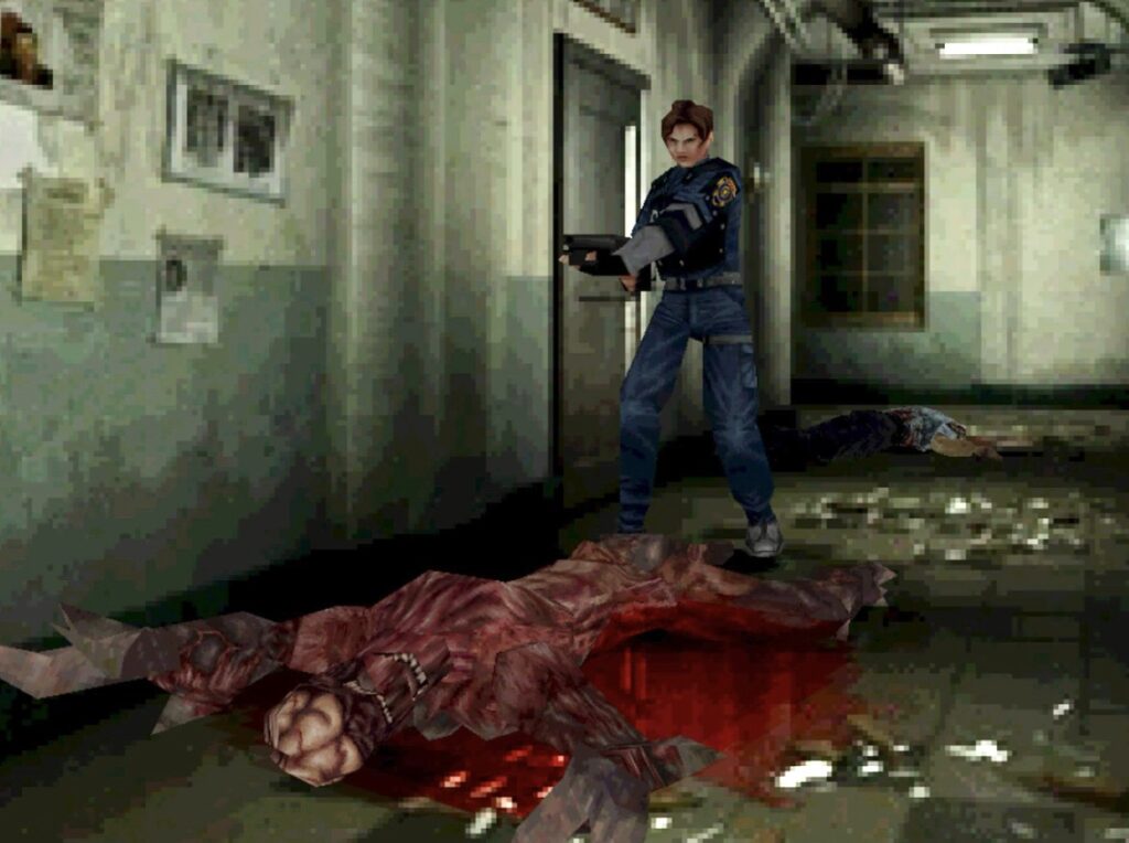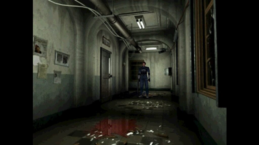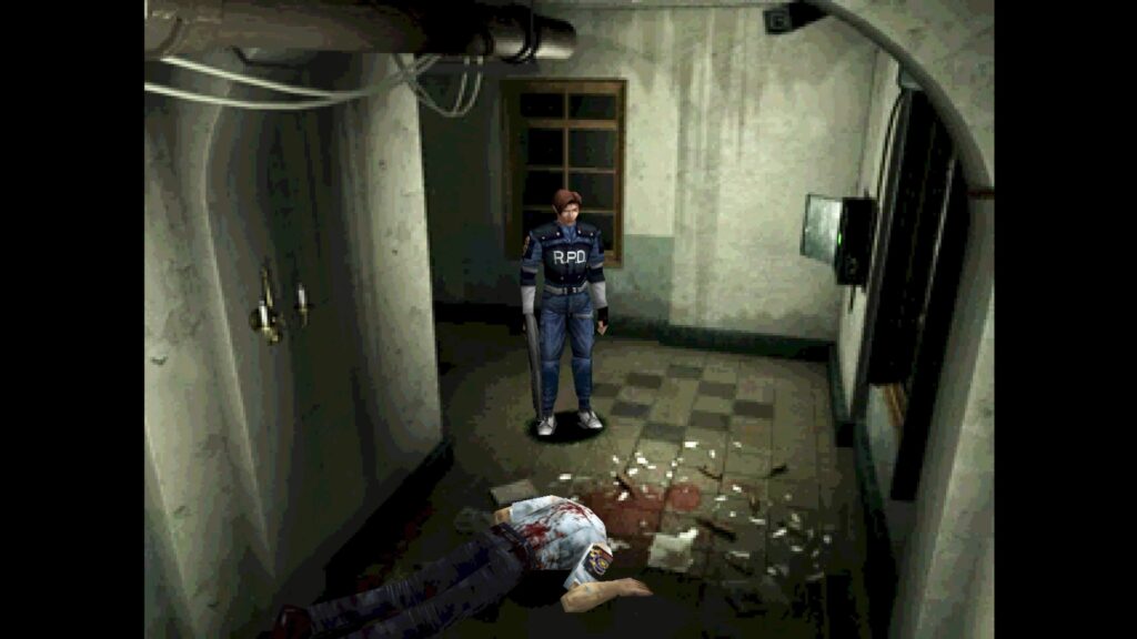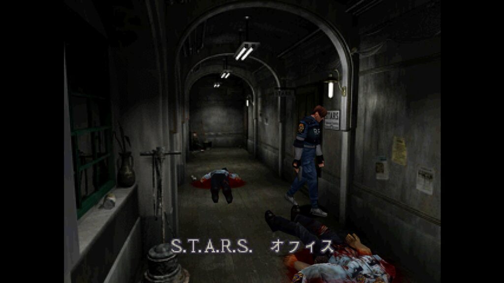 警察署の廊下の角を曲がった先には、ゾンビをチョッキン✂️されたゾンビの屍と、天井から滴る血と、床に残る血溜まり、、、、、。
