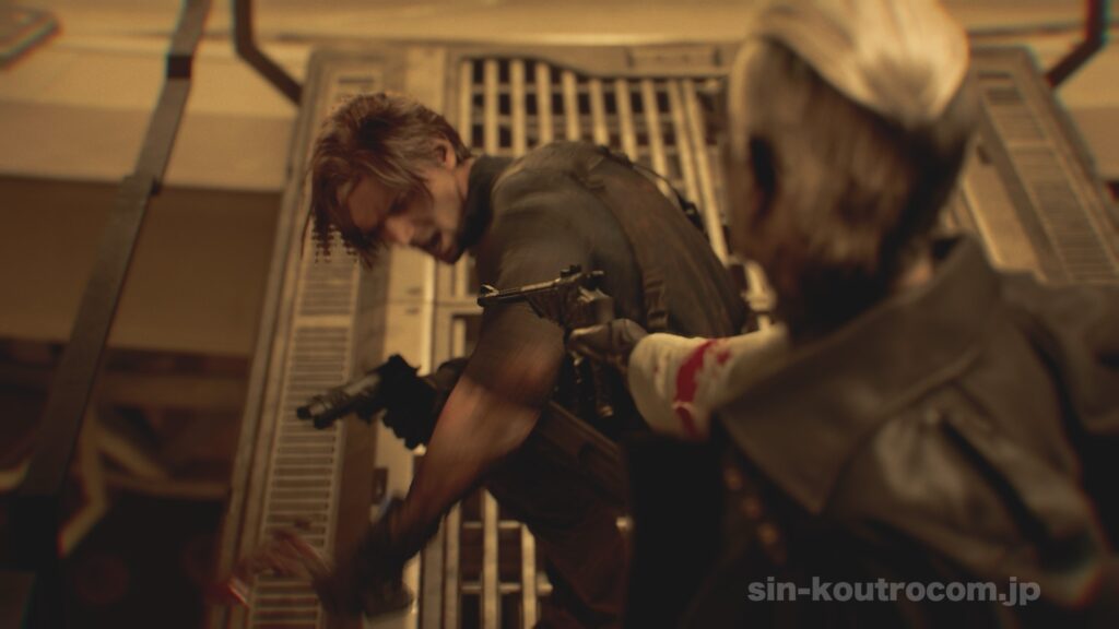 狭いマップで巨体のボスに追われながら多数の感染者に包囲されるなど、強い武器が手に入っても緊張感のあるシチュエーションが続くため、レオン編もホラーゲームとしてのスリルを失わない。