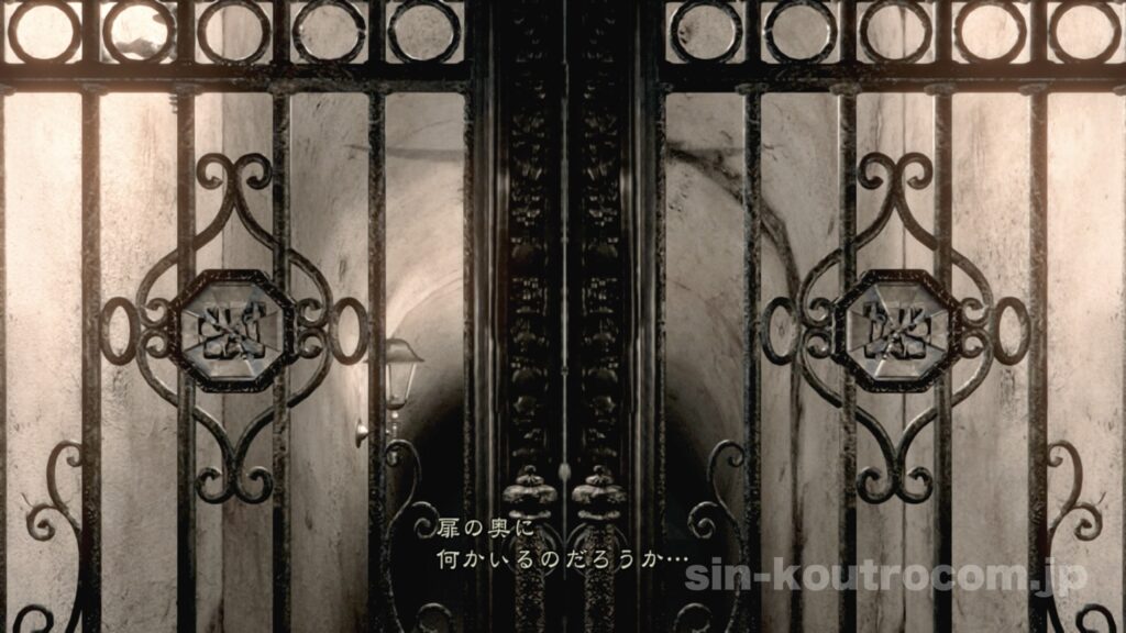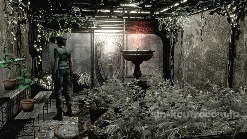 倒すと石と金属の複合エンブレムが手に入り、これを使って中庭への扉を開くことができる。この儀式めいた謎解きは、洋館の中で最も不気味な演出のひとつである。