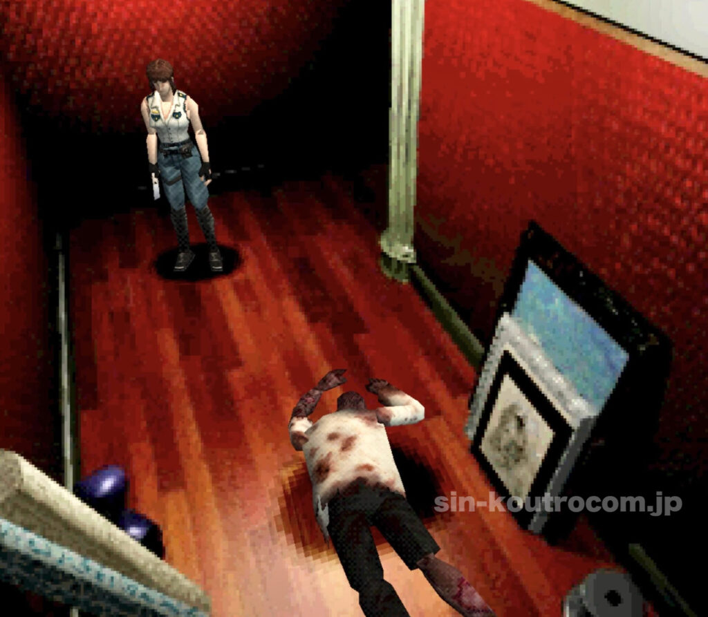 振り向きゾンビの犠牲者となっていたのはS.T.A.R.S.隊員のケネスであり、生ける屍と化した元同僚が人肉を貪るというショッキングな演出は物語上のインパクトも絶大だった。