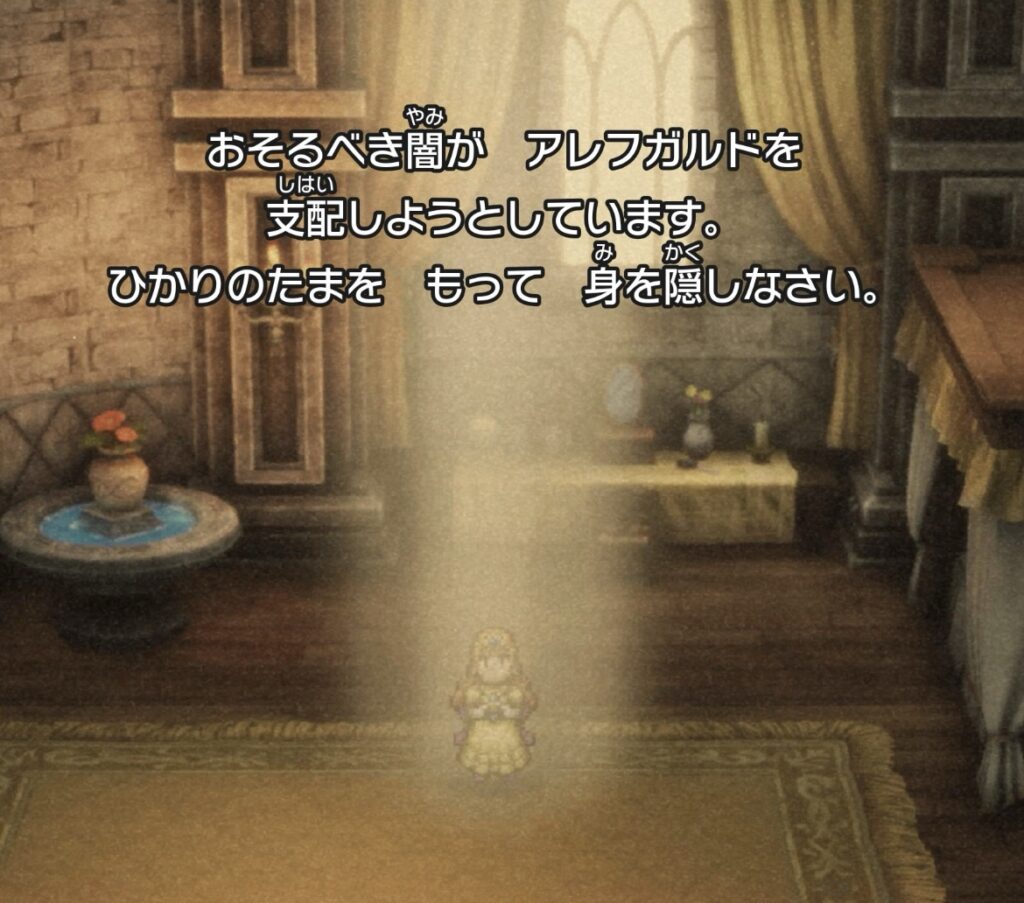 そしたら、実はローラ姫はルビスのお告げを聞くことができる存在で、少し前にルビスから「おそるべき闇がアレフガルドを支配しようとしてるから、ひかりのたまを持って身を隠せ」という告げられたって話に展開。