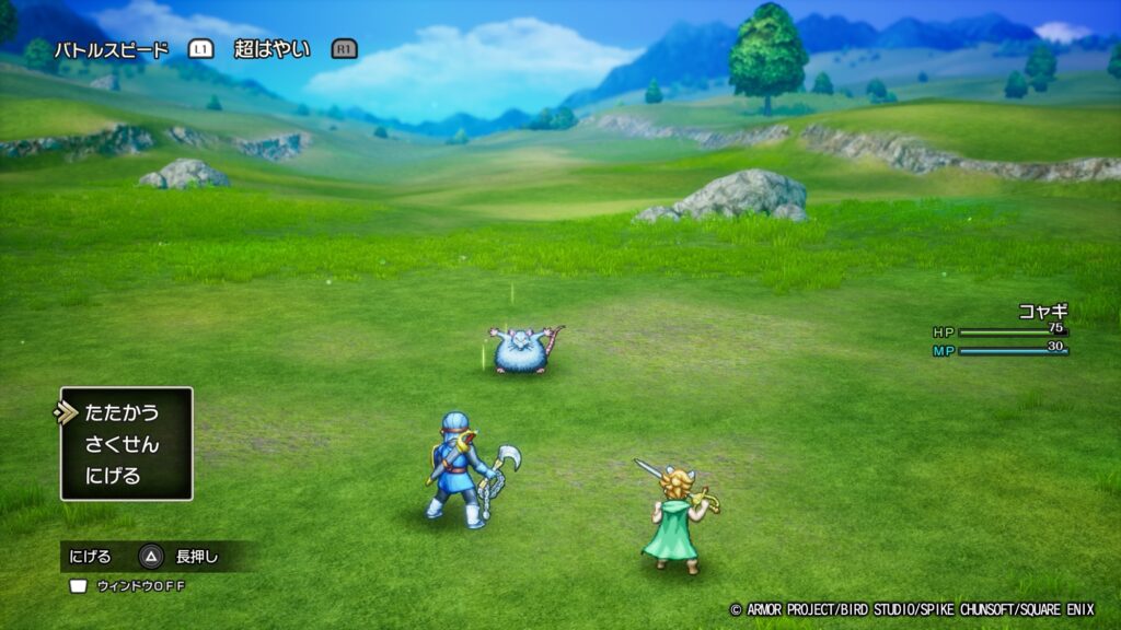 「たたかう」でドラキーくらいなら一撃で倒せる火力があり、「メラ」や「ねむりこうげき」などのちょこまかした攻撃を自動で行ってくれるっぽい。まぁ言うても雑魚筆頭のドラキーだけど、、、笑
