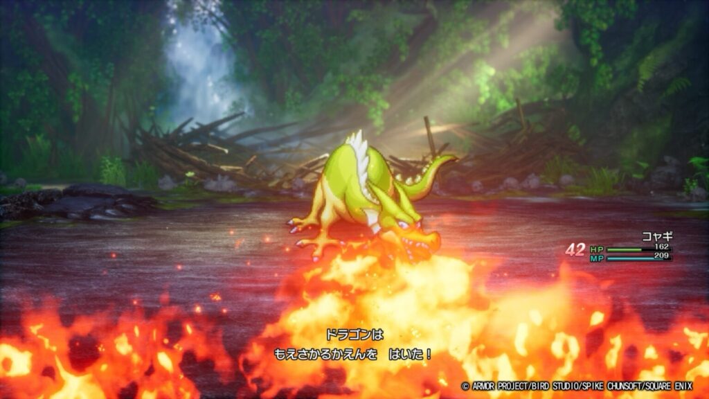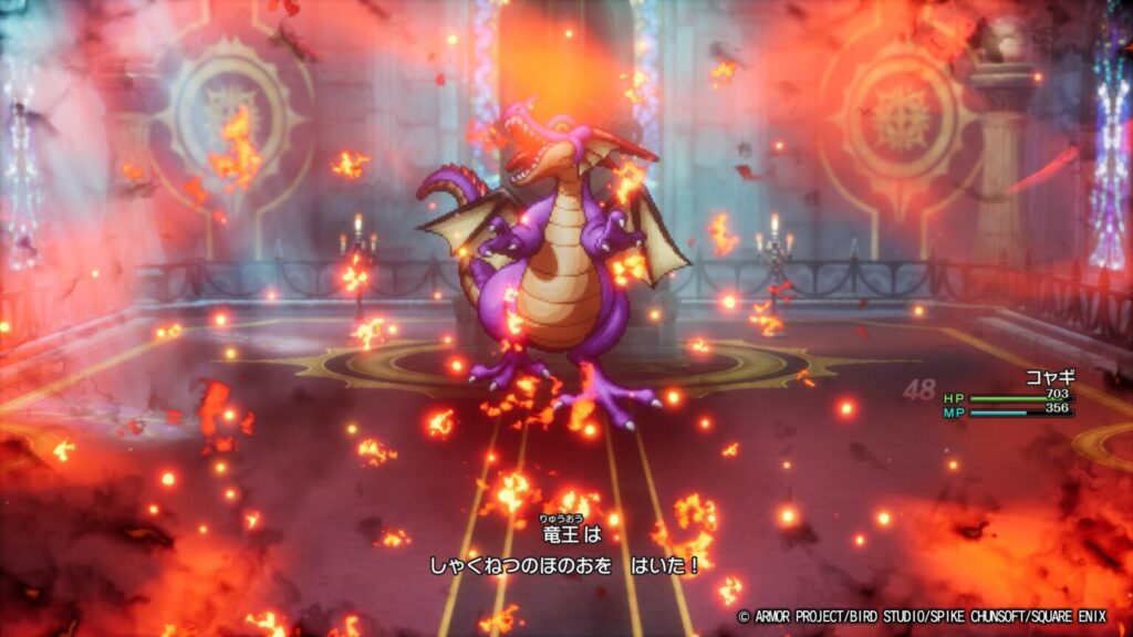 ドラゴンの激しい火炎ブレスは、当時の勇者の防具では防ぎきれないほどの威力を持ち、勇者は「ホイミ」を駆使しながらの長期戦を強いられる。