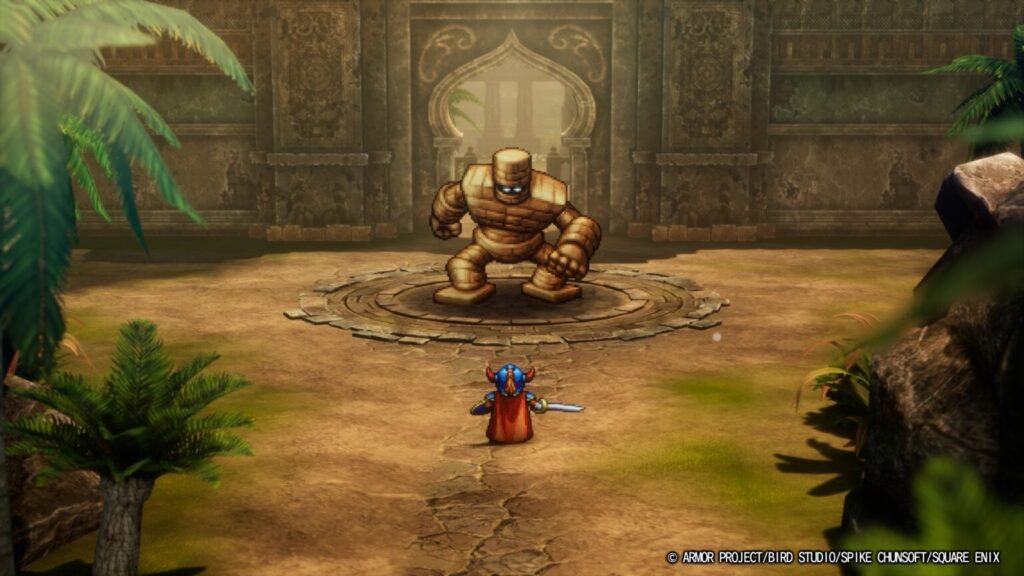 ここで勇者は、マイラの村で入手した「ようせいのふえ」を取り出す。笛の奏でる澄んだ音色は、ゴーレムの意識を深い眠りへと誘い、勇者は無防備となった巨像の隙を突いて門を通過することに成功する。