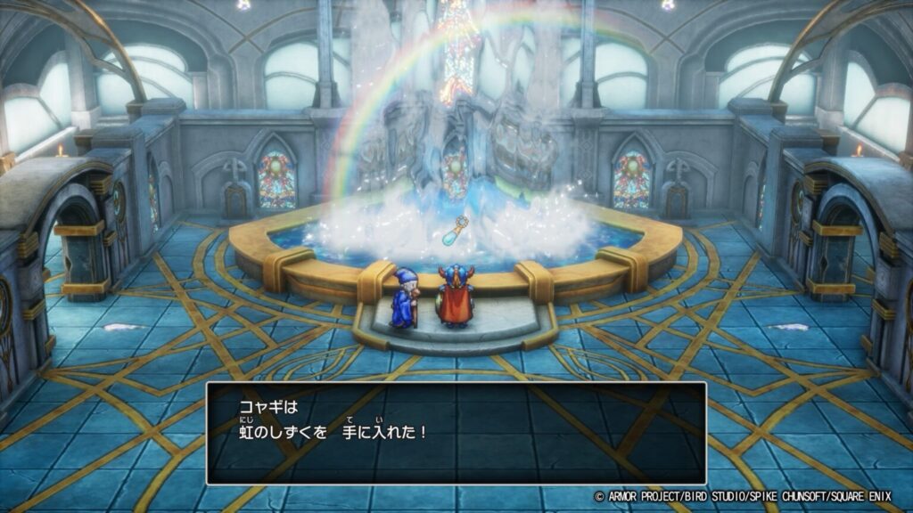 すると、空を切り裂くようにして七色の虹が水平線を超え、対岸の竜王の城へと続く道を作り出した。これは、かつてロトが歩んだとされる伝説の再現であった。
