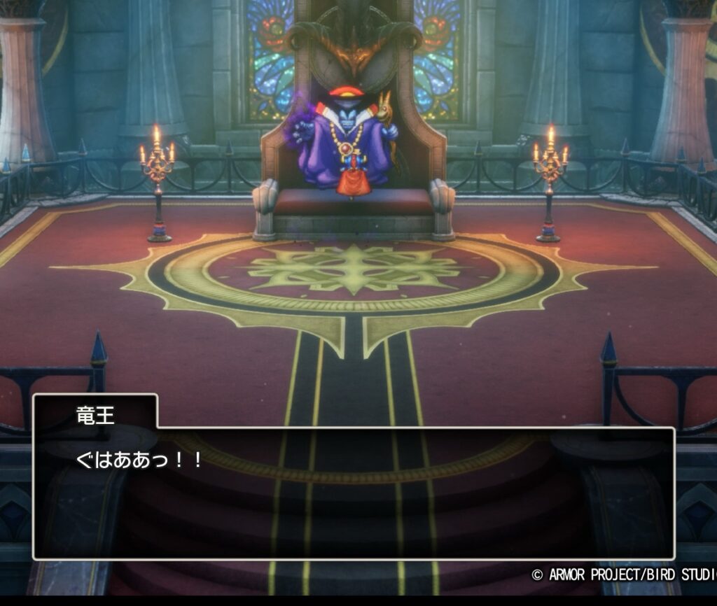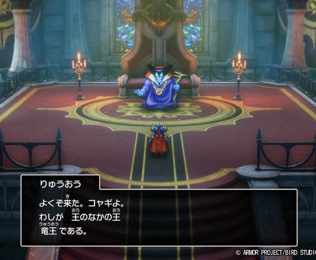 迷宮を突破した勇者の前に現れたのは、巨大な玉座に悠然と腰掛ける一人の男であった。それが、アレフガルドを闇に変えた元凶、竜王である。