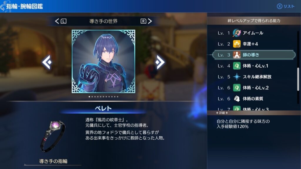 中盤(第14章クリア後)に仲間になる紋章士ベレトの絆Lv3で習得できるスキル「師の導き」は、装備者自身および隣接する味方の得られる経験値を1.2倍(120%)に上げる。