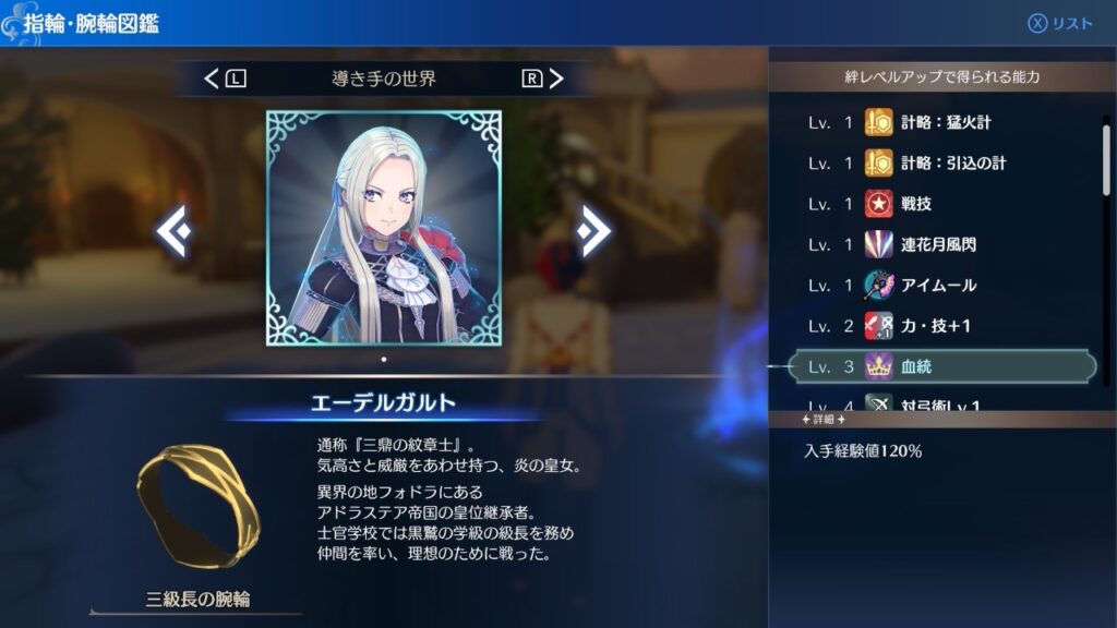 紋章士エーデルガルト(DLC)の絆Lv3で習得できるスキル「血統」は、自身の獲得経験値を1.2倍(+20%)にする効果がある。