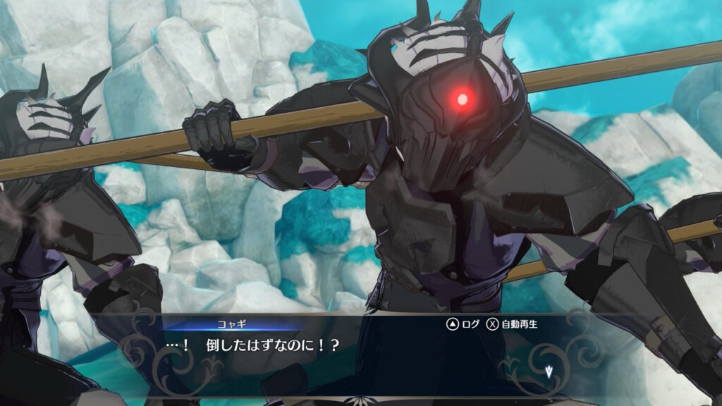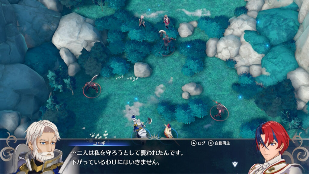 戦闘チュートリアルが続く序盤ということもあり、まず現れた敵は3体のみ。地形(茂み)を利用して有利に戦うなど基本を確認しつつ、リュールとヴァンドレで協力して敵を倒して行く。リュールは訓練通り剣を振るうが、1000年ぶりの実戦ということもあってか思うように敵を倒せず手間取ってしまう。