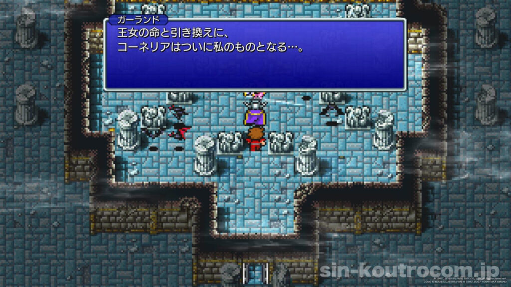 「ま…さか、この私が敗れるとは…」驚愕するガーランドはその場に崩れ落ち、姫は無事救出されたのだ。こうして光の戦士たちは最初の使命を果たし、城へ凱旋する。