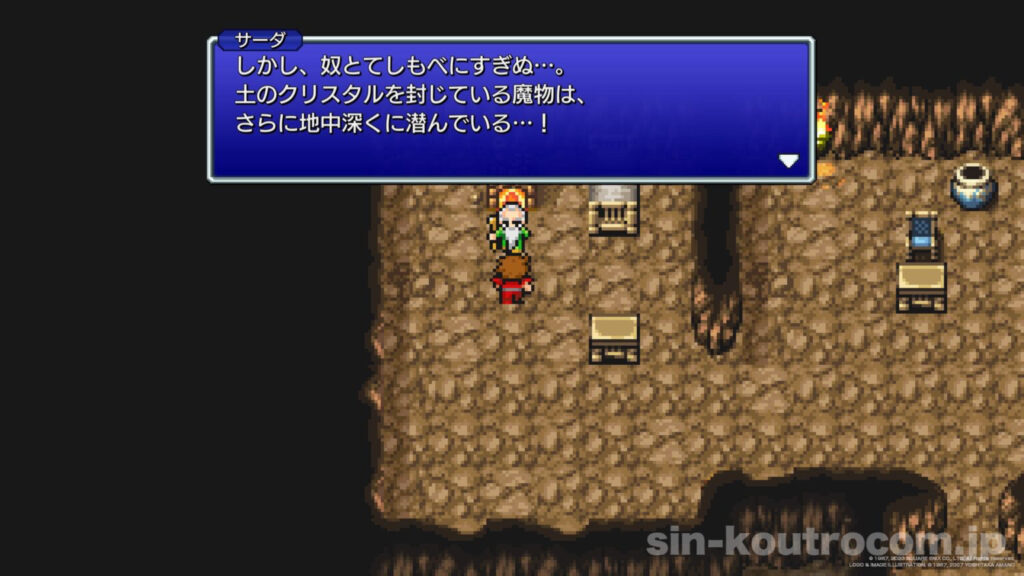 行き詰まった光の戦士たちだったが、各地を旅する中で出会った賢者サーダから助言を得る。サーダは土の洞窟のさらに下層に邪悪な存在を感じ取っており、「これを使いなさい」と一本の『土の杖』を授ける。