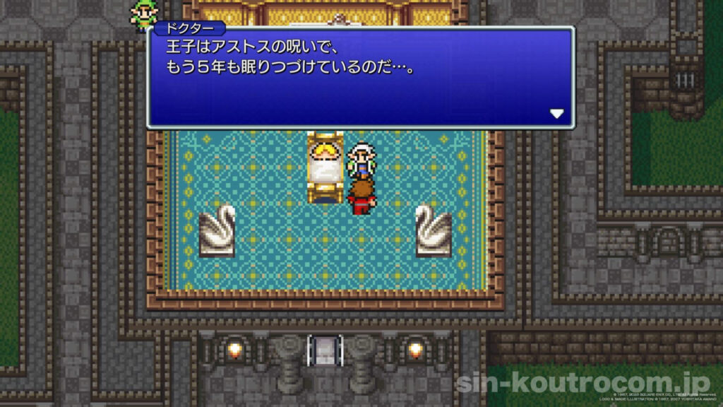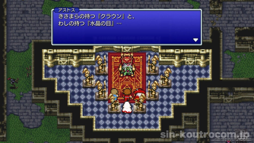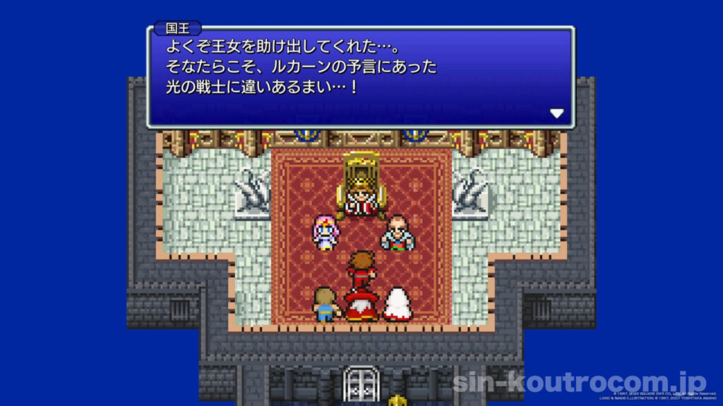 王の嘆きに心を動かされた光の戦士たちは、自ら姫の救出に名乗り出る。彼らの手には闇に輝きを失ったクリスタルが握られており、それを見た王は伝説の光の戦士の到来を確信した。王は「救出に成功した暁には国をあげて協力しよう」と約束し、こうして4人は姫を救うべくカオス神殿へ向かうことに。