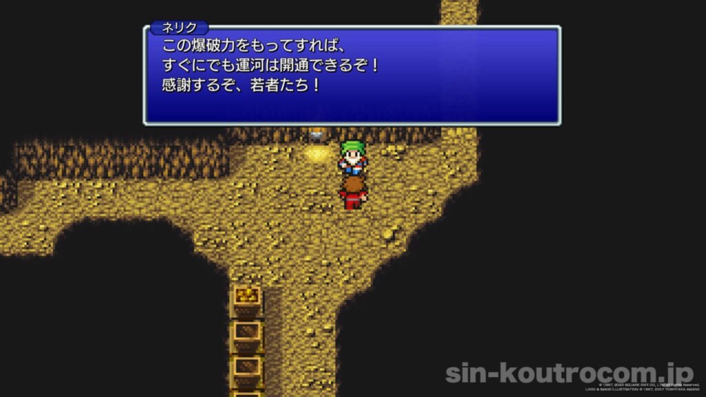 光の戦士たちは世界各地でこの鍵を用いて宝を手に入れ、さらに旅の準備を整えて行く。その中でも『ニトロの火薬』は重要な品だった。コーネリア城の宝物庫で発見した強力な火薬は、大工事にも使える代物である。