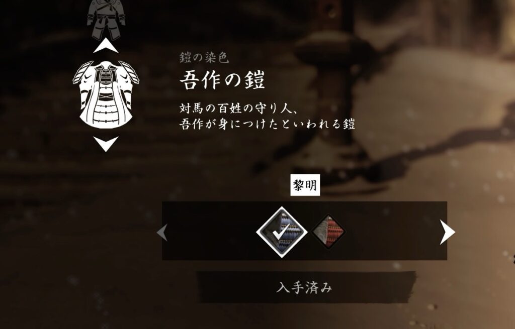 「吾作の鎧」は対馬で語り継がれる伝説の防具で、浮世草とは別枠の伝承クエスト「吾作の伝説」をクリアすることで入手できる。