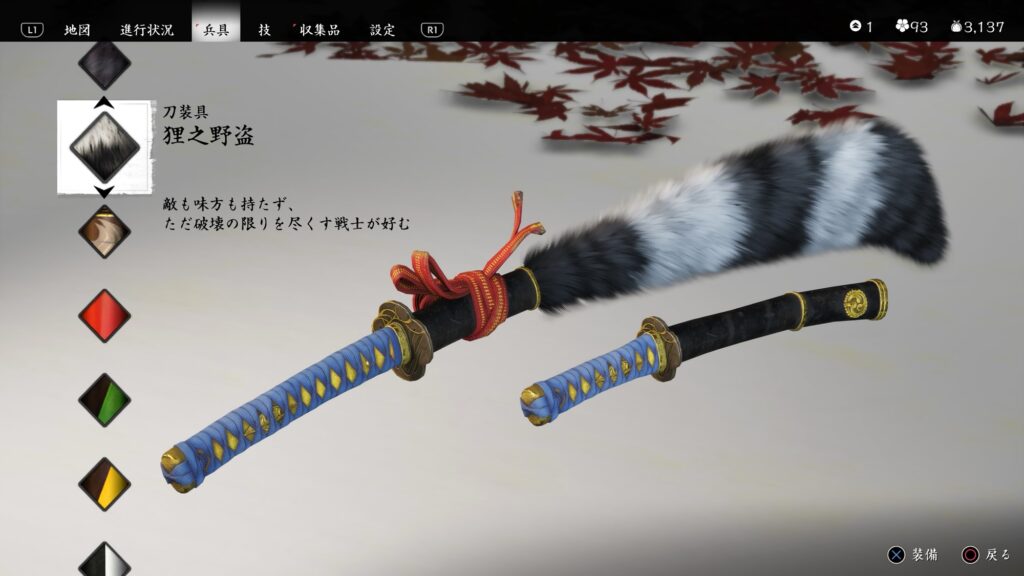 - 刀装具の見た目: 狸之野盗の刀装具は、刀の鞘(さや)に茶色と灰色の縞模様が入り、まるでタヌキ(アライグマ)の尻尾のような意匠が特徴。