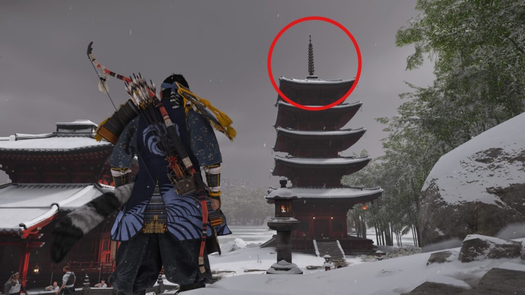 塔の最上部に白布が垂れ下がった箇所があり、そこから鉤縄(かぎなわ)を使って屋根に飛び移ることで登頂できる。頂上にある木箱の上に鉢巻きが落ちているので忘れずに回収しよう。