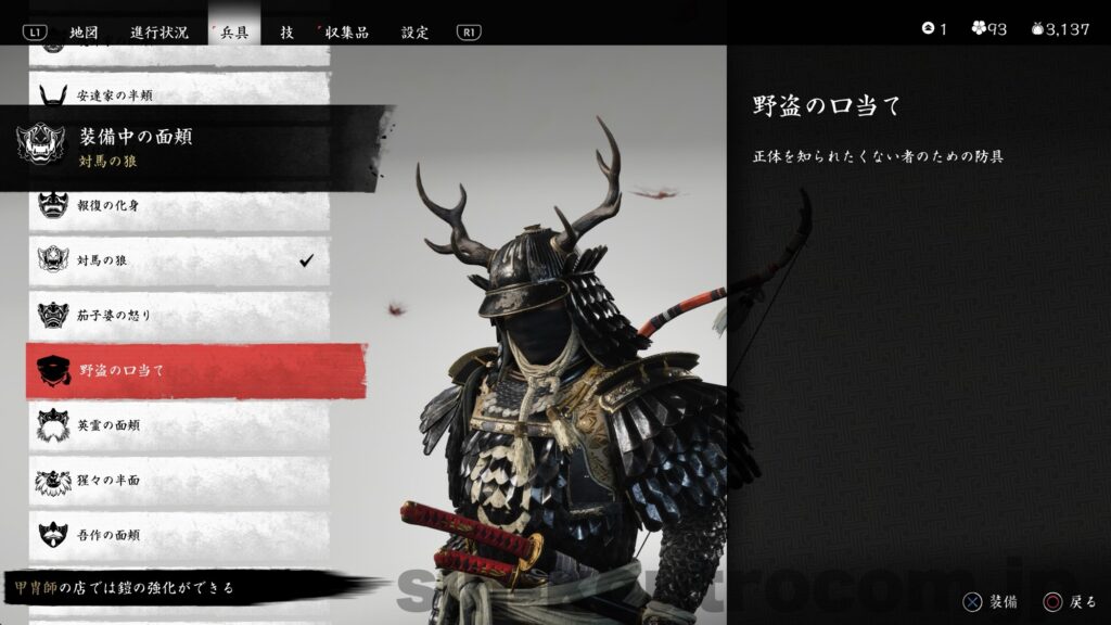 | 面頬 | 野盗の口当て | 贈物の社(各地の拠点にある授かり物台)から入手。 ※メインストーリー守之段「鍛冶場に火を」クリア後、黄金寺などの贈物の社に贈り物として出現(ストーリー進行や民の救出で贈物が追加される)。 |