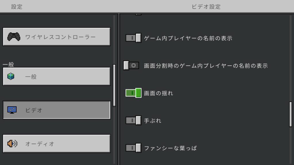 統合版の場合は「設定」→「ビデオ」→「画面の揺れ」をオフ(無効化)に切り替えるだけでOK。画面揺れは3D酔いの大きな要因なので、一番に変更しておきたい設定である。