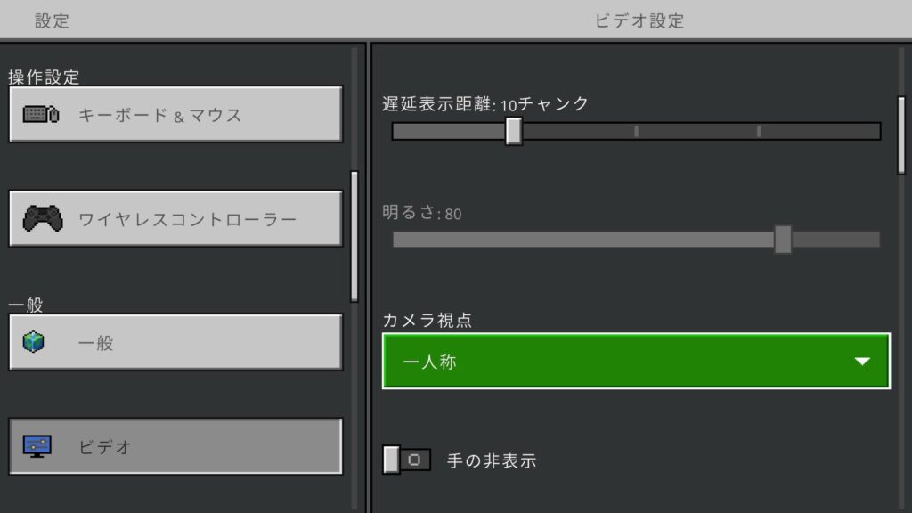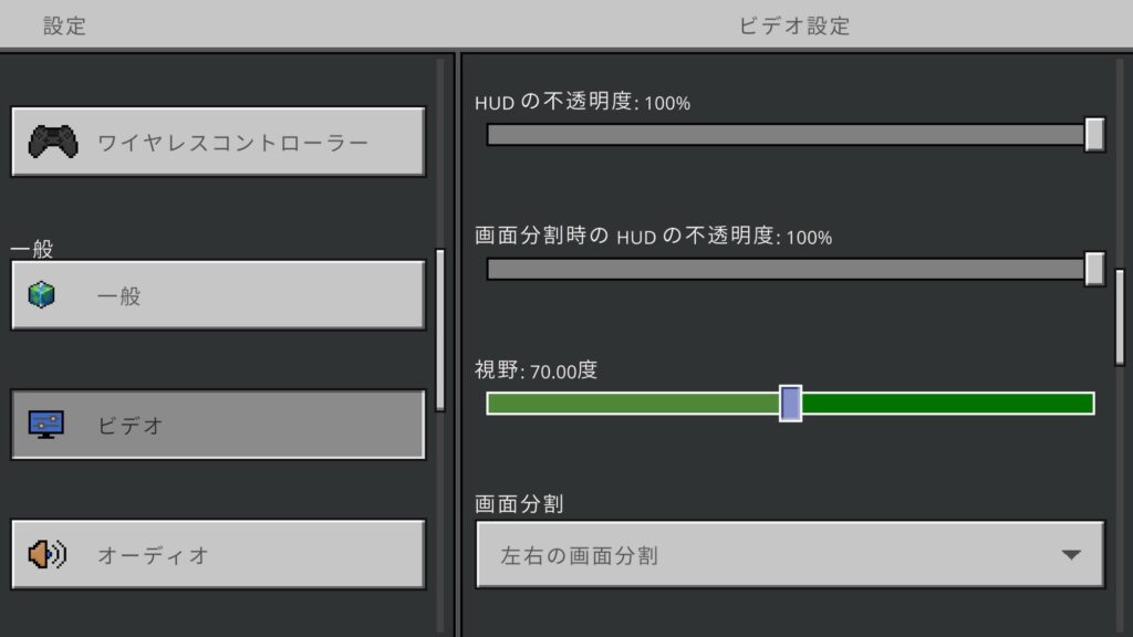 次に視野角(視界の広さ)の設定を調整しよう。統合版では「設定」→「ビデオ」→「視野角」のスライダーで数値を変更できる(デフォルトはだいたい70程度)。