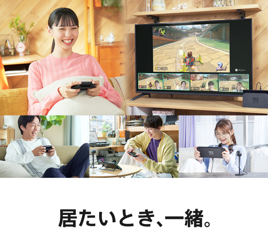 任天堂はSwitch 2のキャッチコピーを「居たいとき、一緒」(All Together, Anytime, Anywhereの意)とし 、世界中のユーザーがいつでも一緒に遊べる環境づくりを重視している。