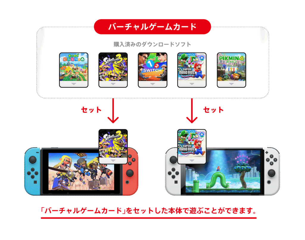 Switch 2におけるデジタルソフト共有と管理の新機能。購入したダウンロード版ゲームの一覧を「バーチャルゲームカード」として本体に表示し、ソフトを仮想的なゲームカードとして他の本体に貸し出したり共有したりできる。
