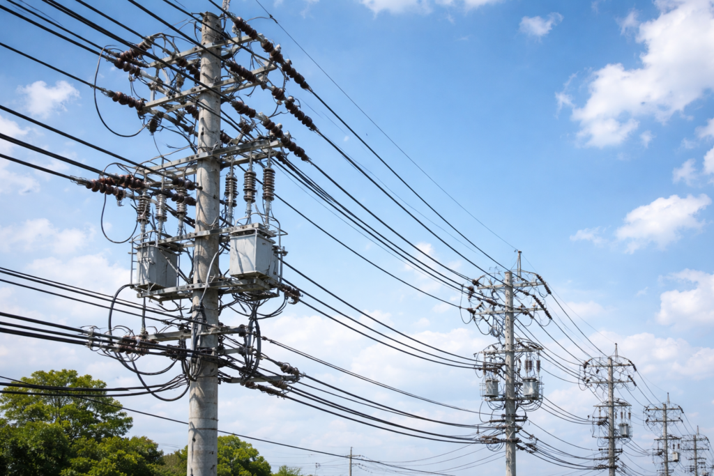 送電線では変電所から遠くの街まで電気を届けるために22,000Vから100万Vもの超高圧を使い 、電圧を上げることで電流を減らし送電ロスを減らしている。このような高電圧の設備は絶縁や安全対策が徹底され、導線が高い位置にあるため私たちが直接触れることはない。