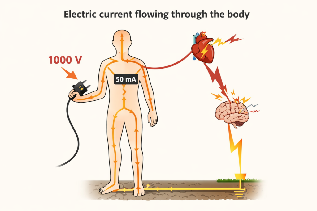 感電による危険度は電圧そのものではなく、体を流れる電流によって決まる。人間の体の抵抗は状況によって大きく変わり、乾いた状態で2,000~5,000Ω、濡れていると500Ω程度まで下がる。
