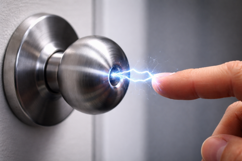 乾燥した日ほど空気中の水分が少なく、体に溜まった電気が逃げにくいため、ドアノブに触れた瞬間に放電しやすくなる。