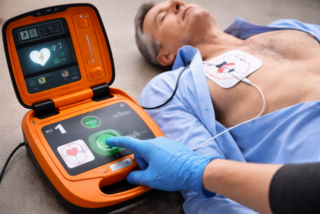 これは非常に短い時間に大きな電気を放出するため、周囲の人が触れると危険だが、電極を胸に貼り付け、機械が心電図を解析して必要なときだけ放電するため安全に使用できる。