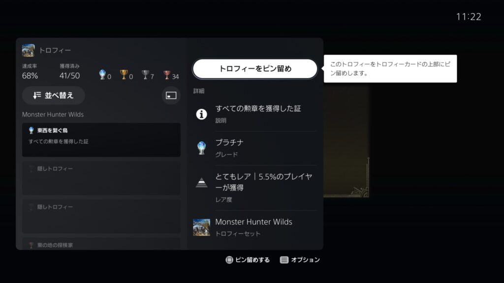 またPS5では最大5つまでのトロフィーをピン留めできる機能があり、特に狙いたいトロフィーを選んでおくとトロフィーカードの上部に固定表示して素早く進捗チェックできる。ピン留めしたトロフィーはゲームプレイ中にも画面にサイド表示させておくこと(ピクチャー・イン・ピクチャー表示)も可能で、収集アイテムの残数などを逐次確認しながら進めるといった使い方もできる。