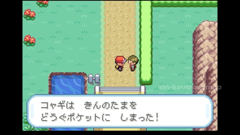人抜きのあと橋の先に立っているのはロケット団のしたっぱ(見た目は普通のトレーナー)で、彼はバトルを申し込む前に「きんのたま」というアイテムを手渡して来る。