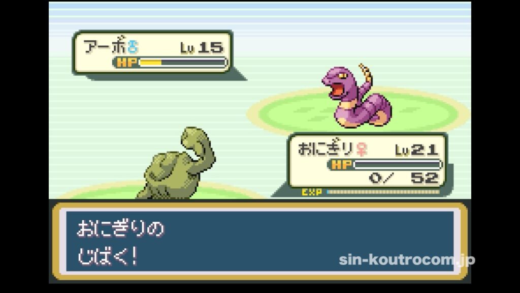 相手のアーボの使う「かみつく」で一定の確率で怯むことはあるものの、イシツブテがやられてしまうことはまず無いので、自爆の発動にはなんら問題はない。