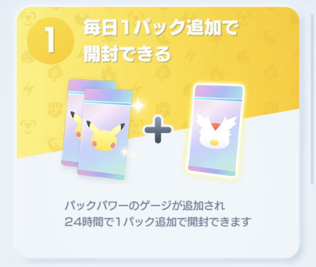 通常プレイヤーが利用できるパック開封とは別に、1日1パック余分にカードパックを開封できる。
