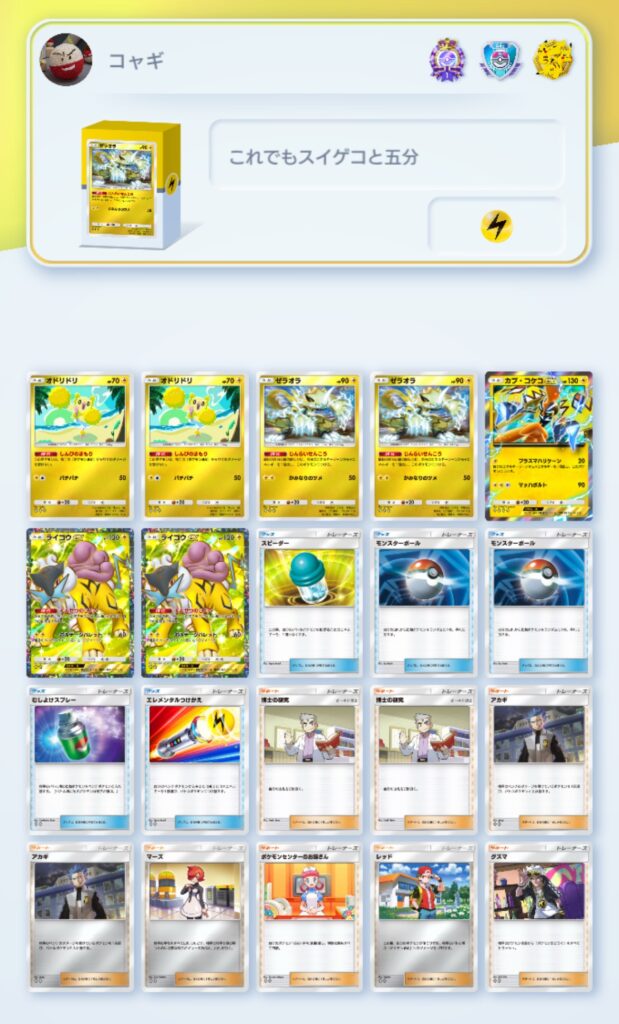まずはライコウ、ゼラオラ、オドリドリの3種類を軸にした雷デッキでございます!
