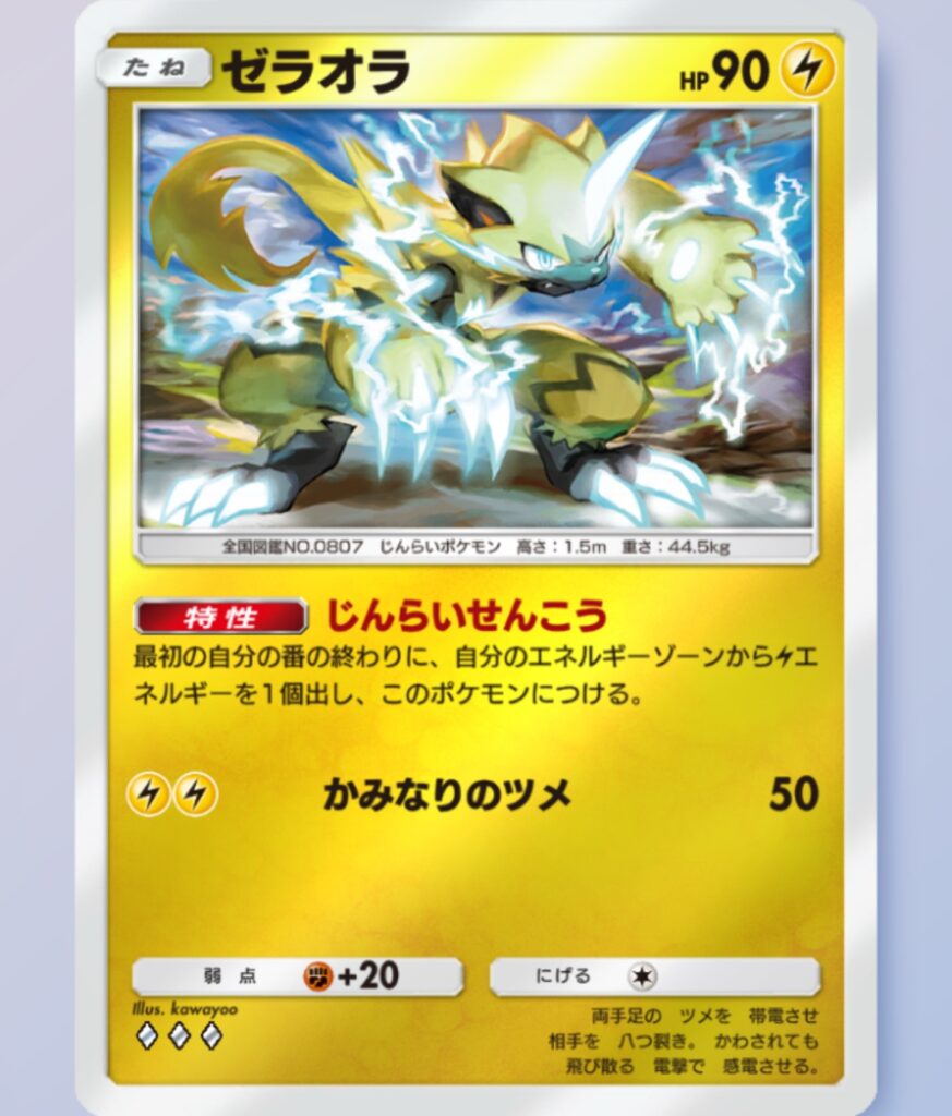 このデッキのキーとなるポケモンはやはりゼラオラかな。やはり水タイプを相手にした時の強さは破壊級!とにかく初手にゼラオラを引けるどうかで随分と戦況が変わってくる。