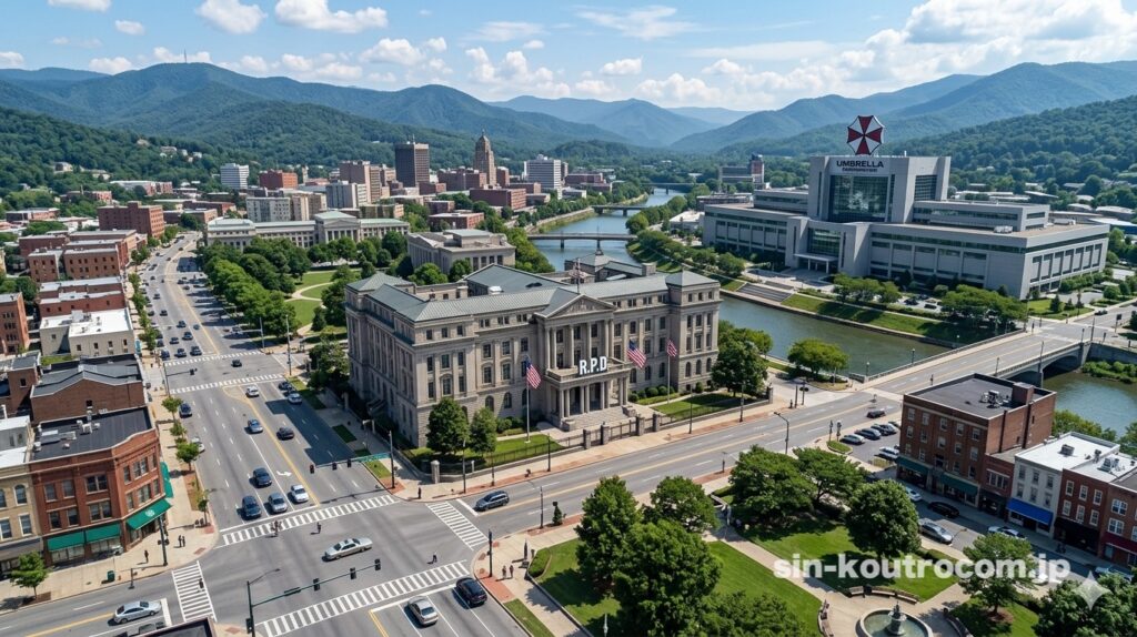 山や川に囲まれた自然環境、アンブレラ社による急速な工業化、時計塔や動物園といった観光名所、そして突然のバイオハザードと滅菌作戦による壊滅――その盛衰はまさにジェットコースターのようだった。