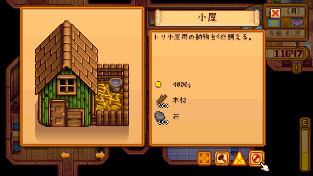 農場が整ってきたら、拡張・改装というフェーズが待っている。納屋・鶏小屋・温室・さらには加工機器(醸造、漬物など)を作ることができる。原材料を集めてクラフトすることで、産物の付加価値を高め、収益効率を上げられる。(ワインなど🍾)