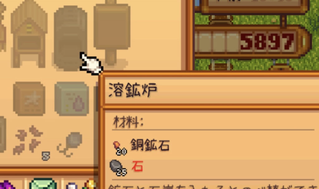 また、クラフトと並んで重要なのがツールのアップグレードだろう。クワやジョウロ、オノやツルハシといった基本ツール類は、鉱山で手に入る銅・鉄・金・イリジウムの鉱石を鍛冶屋で加工することで順に強化できる。