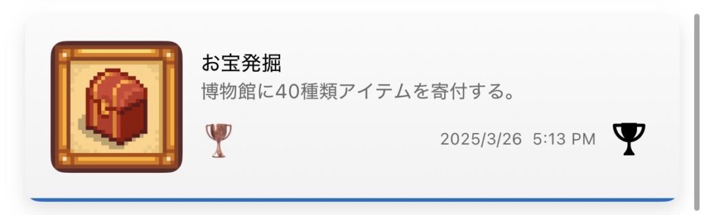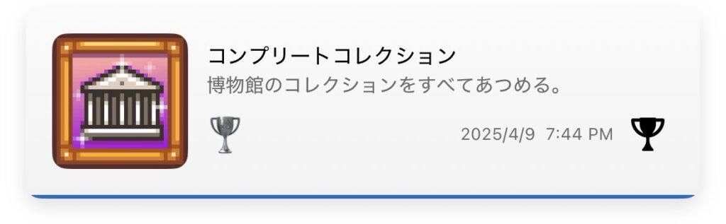 博物館には「お宝発掘」(40種類寄贈)と「コンプリートコレクション」(全95種類寄贈)の2つの実績がある。