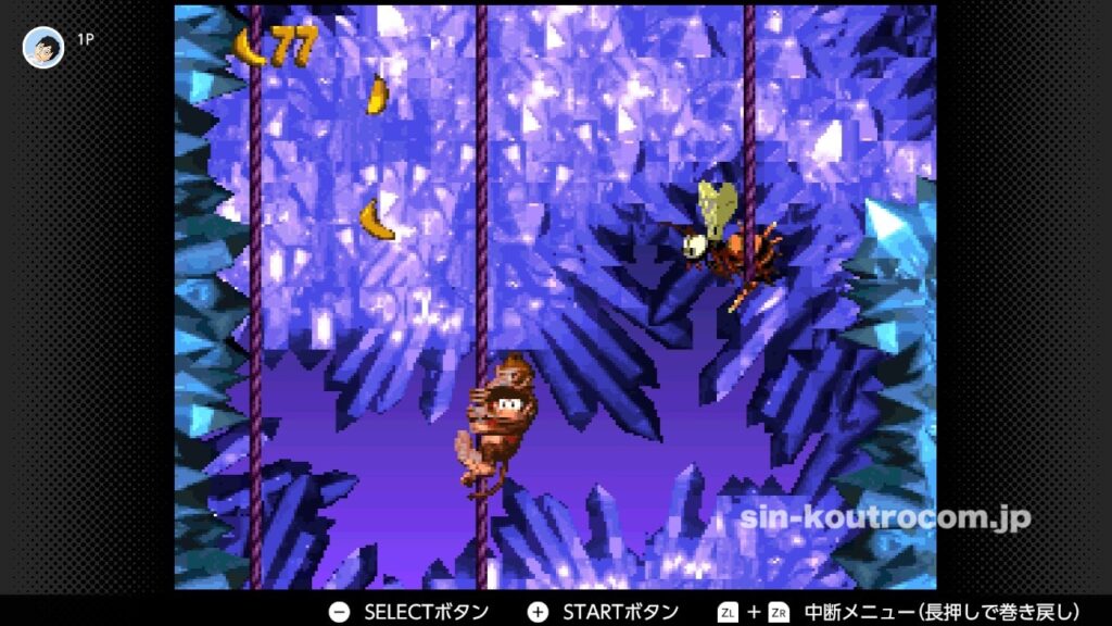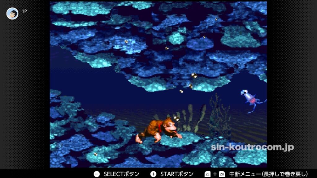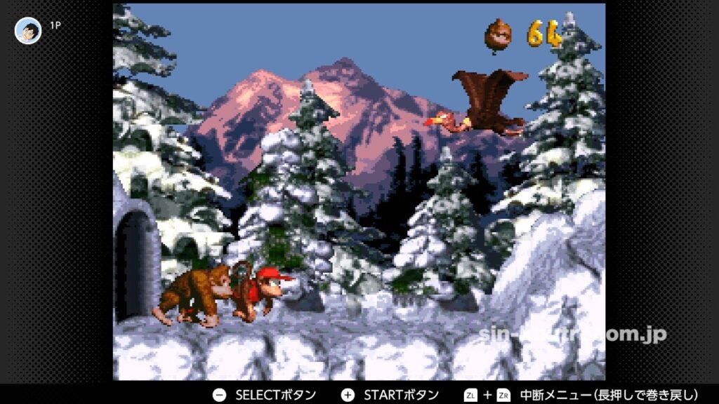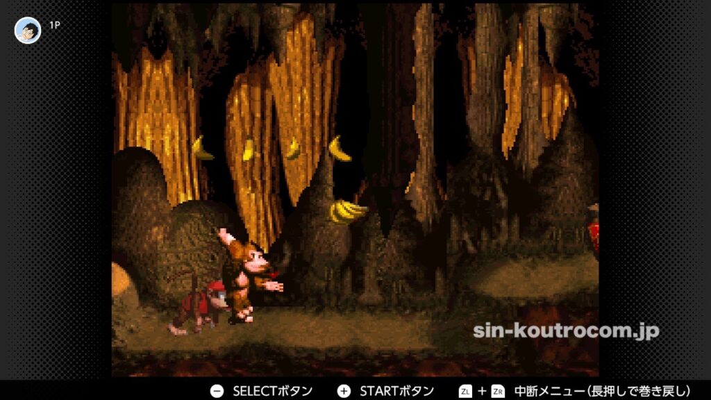 スーパードンキーコングの魅力の一つは、誰でもすぐに覚えられるシンプルな操作。基本的な操作は、十字ボタンで移動し、Bボタンでジャンプ、Yボタンでローリング攻撃やダッシュ、AボタンやSELECTボタンでキャラ交代といったもの。このシンプルさが敷居を下げつつも、多彩なテクニックを生み出す下地となっている。