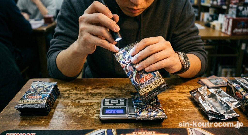遊戯王OCGでは、高レアリティのカードにはホログラム加工や特殊コーティングが施されており、ノーマルカードより厚みや質感が異なる。そのため包装越しに触ったときにわずかな違いが手に伝わり、熟練者であればレア入りパックを見分けられていたと言う。
